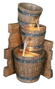 This rustic fountain features three water buckets stacked casually, water flowing in a gentle stream from one into the next. Designed to resemble antique wooden buckets, they bring to mind the rural landscapes and pioneer towns of the American prairie.