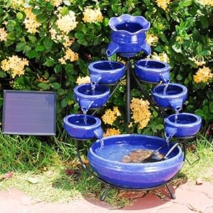 Buy the brilliant Duo Cascade Ceramic Solar Fountain - Blue. This popular stuff is currently available. For this great price, the Duo Cascade Ceramic Solar Fountain - Blue is widely recommended and is a regular choice amongst lots of people. With so many on offer right now, it is wise to have a make you can recognise. This is certainly that and will be a great buy. The supplier have included some great touches and this means great value. You can believe this review, i hope you can try to buy this product if you want know this product. The fountain is a great buy, the duo is only $10 more than the standard one sided fountain so I couldn't pass up the chance to get this one even without any reviews. The fountain is beautiful & easy to put together. I was worried it wouldn't work because the pump seemed flimsy but I've had it a couple days & it works just fine - as long as the solar panel is in FULL sun. The fountain cuts off as soon as a cloud passes or the sun moves out of range. I was disappointed that the solar panel doesn't hold a charge & continue to work when the sun is out of range. I may look into getting a different pump/solar panel in order to fix this issue because the fountain is lovely when it is flowing & I'd like to get maximum usage out of it. Despite the drawback of the solar panel not holding a charge, it is versatile on where you can place it. It came with a stake for the ground and a mounting bracket with screws included. Also, the cord is very long, which made finding the perfect spot for my fountain fairly easy. My solar panel has gone from staked in the ground, mounted to the deck railing with little effort. Tonight I may give the roof a try just to see if that will get more flow time out of the fountain before I resort to getting a new panel. This item came packaged perfectly, I'd read a few reviews about broken bowls but each bowl was bubble wrapped & cushioned with extra cardboard. I love that the cord from the pump to the top bowl is black rather than clear, it blends with the black frame better than clear, in my opinion. Water tends to lightly splash out of the bowl which is causing me to have to refill the bowl often because the pump may be to powerful but this is something I'll take care of if I get a new pump/solar panel. This fountain was such a good buy for that price I dont mind having to get another pump. It is a beautiful addition to my backyard.