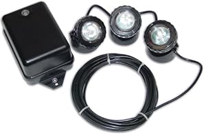 Accent your fountain or decorative water feature with the Beckett Complete Three Pond Light Kit and Transformer. Use this set of three submersible lights to highlight a waterfall, illuminate a garden path, or throw shafts of light throughout your water feature. The lights may be placed either on the ground outside of your water feature or submerged to better highlight flowing water and aquatic plants. Each unit has a fully adjustable head to angle the light in any direction. The included transformer powers your light feature by translating 120 volt power to a safe and economical 12 volt supply, and can power up to three additional 10 watt lights (not included). An easy to set programmable timer can control the item, or an automatic light sensor may be used to turn the lights on at dusk and off again at dawn. Dramatically light your water feature or garden with this Complete Three Pond Light Kit and Transformer. Kit includes three 10 watt lights on a 20 foot cord. Small and compact with adjustable angle, low voltage transformer (60 watts) with extra wattage for expansion.