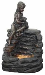 The sweet young girl sits atop the stone pile with her darling puppy gazing into the lighted pond below. The resin fountain fashioned, after a stone waterfall, is both mesmerizing and charming, a welcome addition to your home indoor or out. Constructed of stone composite and finished to resemble natures beautiful stones.