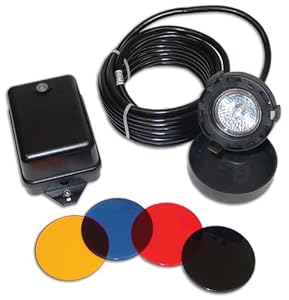 This compact yet powerful halogen light accents pond features, fountains, and waterfalls. The four colored lenses are easily interchanged for different effects. The kit features safe, 12 volt operation, a convenient 20 foot power cord, automatic day time "off" sensor on the transformer, and extra wattage for future expansion! This high intensity light is intended for underwater use only and is not intended for swimming pools or spas due to the erosion to the color finish that occurs when the fixture comes in contact with chlorine.